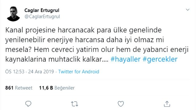 Kanal D ekranlarında yayınlanan Afili Aşk dizisinin Kerem'i Çağlar Ertuğrul geçtiğimiz gün sosyal medya üzerinden paylaştığı yazıyla konuşuldu. Ülke gündemine oturan Kanal İstanbul projesi hakkında görüş belirten oyuncu “Kanal projesine harcanacak para ülke genelinde yenilenebilir enerjiye harcansa daha iyi olmaz mi mesela? Hem çevreci yatırım olur hem de yabancı enerji kaynaklarına muhtaçlık kalkar.'' dedi. Bunun üstüne ''Siyasete oyunculuğun bittiği zaman atılırsın.'' yorumunu yapan bir kullanıcıya oyuncu Çağlar Ertuğrul ne cevap verdi?