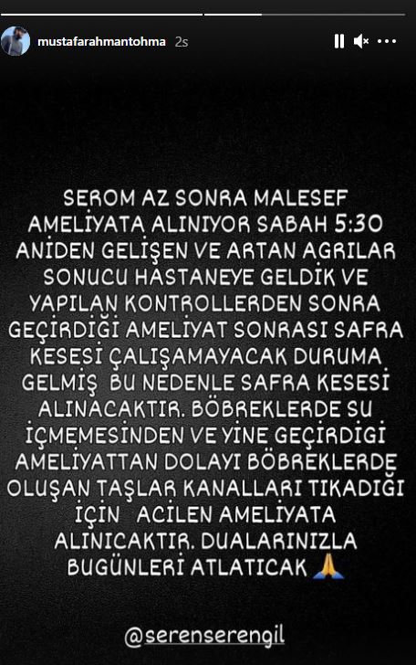 Seren Serengil'in durumunu sevgilisi Mustafa Tohma sosyal medya hesabından paylaştı. Tohma, "Serom az sonra maalesef ameliyata alınıyor. Sabah 5:30 aniden gelişen ve artan ağrılar sonucu hastaneye geldik. Yapılan kontrollerden sonra geçirdiği ameliyat sonrası safra kesesi çalışamayacak duruma gelmiş. Bu nedenle safra kesesi alınacaktır. Böbreklerde su içmemesinden ve yine geçirdiği ameliyattan dolayı böbreklerde oluşan taşlar kanalları tıkadığı için acilen ameliyata alınacaktır. Dualarınızla bugünleri atlatacak" ifadelerini kullandı.