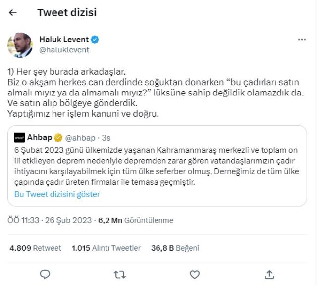 Konuyla ilgili konuşan Ahbab Başkanı Haluk Levent :"Yaptığımız her işlem kanuni ve doğru.Sonra öğrendik.Kızılay Çadır ve Tekstil A.Ş. Kızılay'ın alt iştiraki olan tüzel kişilikmiş.Kızılay da bu şirketten çadırları faturalı satın alıyorlarmış.Ahbap da aynı yöntemle toplanan bağışlarla bu şirketten satın alma gerçekleştirmişti.Zaten sitelerinde açıklama bulunuyor"dedi.