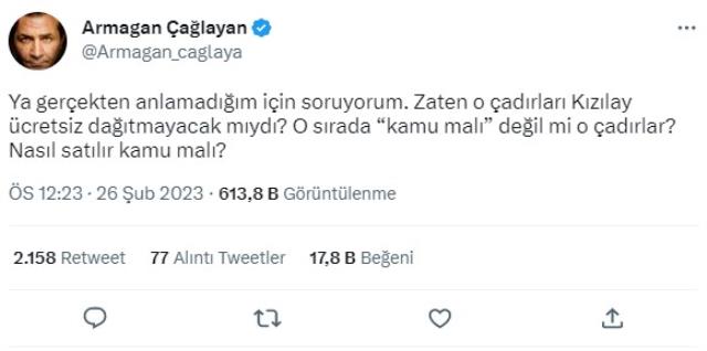Armağan Çağlayan,"Ya gerçekten anlamadığım için soruyorum.Zaten o çadırları Kızılay ücretsiz dağıtmayacak mıydı?O sırada "kamu malı" değil mi o çadırlar?Nasıl satılır kamu malı?"paylaşımını yaptı.