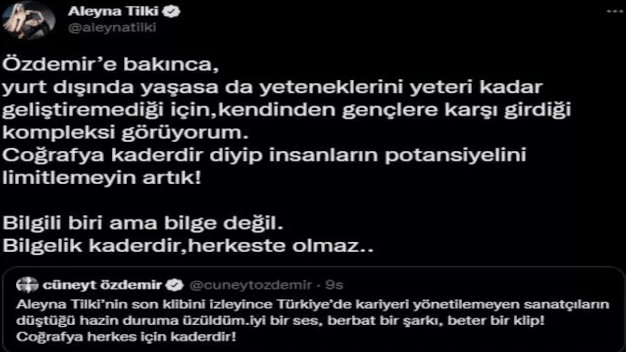 Ünlü şarkıcı Aleyna Tilki bu günlerde son klibindeki kıyafetiyle magazin basını ve sosyal medyanın gündeminden düşmüyor. Ünlü şarkıcı uzun zamandır üzerinde çalıştığı Take It Or Leave It şarkısına çektiği kliple gündemin en üst sırasında yer alıyor. 13 saatte bir milyondan fazla izlenen klip pek çok ünlü isim tarafından eleştirildi. Bu isimlerden biri de ünlü haberci Cüneyt Özdemir oldu. Cüneyt Özdemir Aleyna Tilki için “Aleyna Tilki’nin son klibini izleyince Türkiye’de kariyeri yönetilemeyen sanatçıların düştüğü hazin duruma üzüldüm. İyi bir ses, berbat bir şarkı, beter bir klip! Coğrafya herkes için kaderdir” ifadelerini kullandı. Bunun üzerine sosyal medya hesabından bir paylaşım yapan Aleyna Tilki Cüneyt Özdemir’e cevap verdi. Aleyna Tilki paylaşımında “Özdemir’e bakınca, yurt dışında yaşasa da yeteneklerini yeteri kadar geliştiremediği için, kendinden gençlere karşı girdiği kompleksi görüyorum. Coğrafya kaderdir deyip insanların potansiyelini limitlemeyin artık” ifadelerini kullandı.