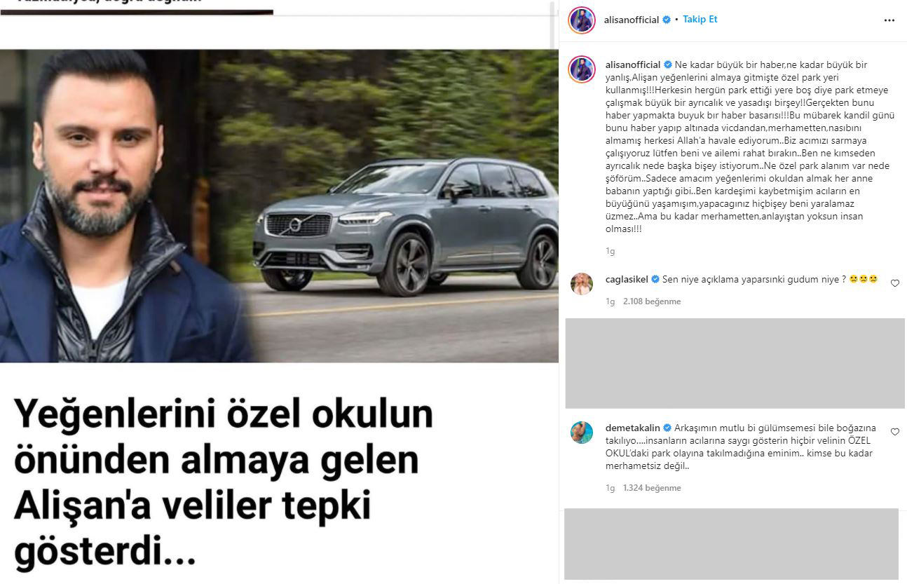 Ünlü şarkıcı Alişan hakkında geçen hafta medyaya yansıyan bir iddia ortaya atılmıştı. Koronavirüs nedeniyle genç yaşta vefat eden kardeşi Selçuk Tektaş'ın çocuklarını okula götürüp getiren Alişan için özel park yeri tutulduğu iddia edilmişti. Diğer velilerin bu konuda şikayetçi olduğu ve yapılan ayrımcılığa tepki gösterdikleri de iddialar arasında yer alıyordu. Alişan geçen hafta hakkında yapılan bu haberlere sosyal medya hesabı üzerinden cevap verdi ve iddiaları yalanladı. "Ne özel park alanım var ne de şöförüm" diyen Alişan yapılan haberlere isyan etti.