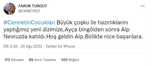 Gold Filmin sahibi dizinin yapımcısı Faruk Turgut sosyal medyadan Alp Navruz’un da diziye dahil olduğunu şu sözlerle ifade etti.