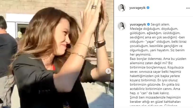 Arka Sokaklar 18 Haziran Cuma akşamı sezon finali yaptı. Yeni sezonda yine ekranda olacak sevilen diziden oyuncu Yüsra Geyik'in ayrılacağı öğrenilmişti. Yüsra Geyik de dün sosyal medya hesabından duygusal bir veda mesajı yayınlandı. Setteki son çekim videolarını paylaşan Yüsra Geyik paylaşımına bir not ekledi;