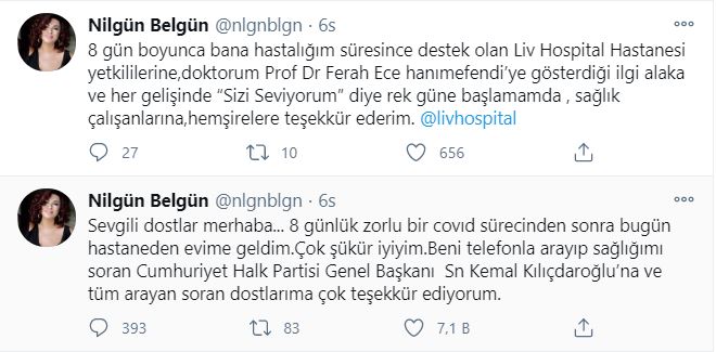 Usta oyuncu Nilgün Belgün de geçirdiği zorlu günler sonrasında sevenlerine güzel haber verdi. Twitter hesabından teşekkür paylaşımı yapan Belgün şunları yazdı; "Sevgili dostlar, merhaba... 8 günlük zorlu bir Covid sürecinden sonra bugün hastaneden evime geldim. Çok şükür iyiyim. Beni telefonla arayıp, sağlığımı soran Cumhuriyet Halk Partisi Genel Başkanı Sayın Kemal Kılıçdaroğlu'na ve tüm arayan, soran dostlarıma çok teşekkür ediyorum. 8 gün boyunca bana hastalığım süresince destek olan Liv Hospital Hastanesi yetkililerine, doktorum Prof Dr Ferah Ece hanımefendi’ye gösterdiği ilgi alaka ve her gelişinde “Sizi Seviyorum” diyerek güne başlamamda, sağlık çalışanlarına, hemşirelere teşekkür ederim."