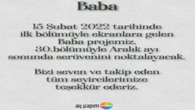 Geçtiğimiz sezon sonlarına doğru başlayan ve kadrosuyla büyük yankı uyandıran Baba dizisi başladığı günden itibaren Show Tv’nin en değerli ve en iddialı yapımları arasında yer aldı. Ay Yapım tarafından hazırlanan dizi büyük bir iddia ile yayına başlarken reytinglerde oldukça yüksek rakamlara ulaşacağı tahmin ediliyordu. Tanıtımları ve usta isimleriyle adından sıkça söz ettiren yapım ne yazık ki ilk bölümden itibaren seyirciden beklenen ilgiyi göremedi. Her bölüm reytinglerde hayal kırıklığı yaratan ve ilk ona dahi girmekte zorlanan dizinin geçtiğimiz sezon sonunda final yapacağı iddia edilmişti. Ancak yayıncı kanal Show Tv Baba için bir sezon daha yayın kararı aldı ve bu dizinin son şansı olarak görüldü. 2022 – 2023 sezonuna toparlanmış ve bir kez mücadele edecek halde giren dizi ne yazık ki reytinglerde bir türlü istenilen rakamları yakalayamadı. Her hafta acabalarla yayına giren dizi gelen reytinglerle bir kez daha hem kanalını hem de yapım şirketini hüsrana uğrattı. Her hafta final kararı beklenen dizi için sonunda karar verildi ve dizinin final yapması kararlaştırıldı.