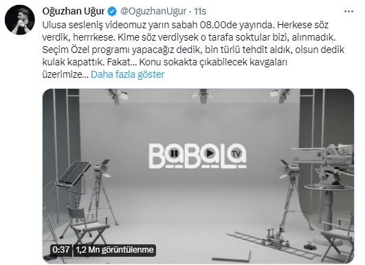 Babala TV siyasi parti liderlerini ve adayların ulusa sesleniş konuşmalarına yer vereceği seçim özel programını yayınlamama kararı aldı. Babala Tv sahibi ve sunucusu Oğuzhan Uğur normalde hiçbir tehdite papuç bırakmadıklarını ama bu sefer ytehditlere kulak asmak zorunda kaldıklarını zira tehditin kendilerinin yanı sıra sokaklara taşma tehlikesini de içerdiğini paylaştığı şu sosyal medya patlaşımıyla duyurdu : "Seçim Özel programı yapacağız dedik, bin türlü tehdit aldık, olsun dedik kulak kapattık. Fakat… Konu sokakta çıkabilecek kavgaları üzerimize yıkma boyutuna geldi" diyen Uğur, "Gelen ihbarlara ilk defa itibar ettik, orada durun dedik. Yanımda 20-25 yaşında gençler çalışıyor. Kimseye böyle bir fırsat veremem"