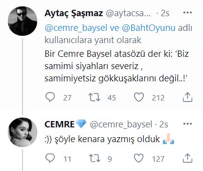 Cemre Baysel'in emojili paylaşımına Aytaç Şaşmaz, "Bir Cemre Baysel atasözü der ki: ‘Biz samimi siyahları severiz , samimiyetsiz gökkuşaklarını değil..!’" yorumu yaptı. Cemre Baysel de "Şöyle kenara yazmış olduk" diyerek Şaşmaz'a yanıt verdi. İkilinin paylaşımları ise hayranlarının takibindeydi.