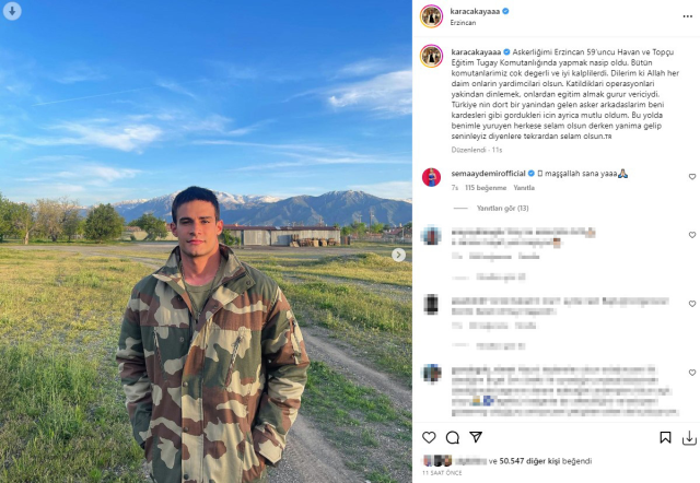 Sosyal medya hesabından askerlik fotoğraflarıyla beraber askerlikle ilgili düşünce ve duygularını şu şekilde anlattı; "Askerliğimi Erzincan 59'uncu Havan ve Topçu Eğitim Tugay Komutanlığı'nda yapmak nasip oldu. Bütün komutanlarımız çok değerli ve iyi kalplilerdi. Dilerim ki Allah, her daim onların yardımcıları olsun. Katıldıkları operasyonları yakından dinlemek, onlardan eğitim almak gurur vericiydi. Türkiye'nin dört bir yanından gelen asker arkadaşlarım beni kardeşleri gibi gördükleri için ayrıca mutlu oldum. Bu yolda benimle yürüyen herkese selam olsun derken yanıma gelip 'seninleyiz' diyenlere tekrardan selam olsun"