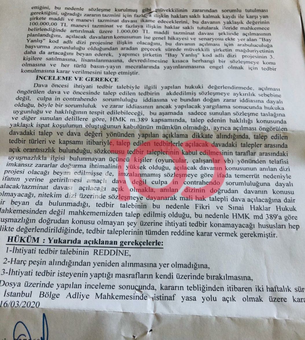 tv100'den Birsen Altuntaş'ın haberine göre önceki hafta İstanbul Adliyesi 7. Asliye Ticaret Mahkemesi’ne başvuran Kanal D, ilk bölümü yayınlanan Bay Yanlış dizisi için ihtiyati tedbir kararı aldırmak istedi. Lakin talep reddedildi. Kara üzerine şansını bir kez daha denemek isteyen Kanal D, 2 Temmuz’da bu kez 2. Asliye Ticaret Mahkemesi’ne başvurdu. İlk başvurusunda dizinin yayından kaldırılması için başvuru yapan Kanal D, ikinci başvurusunda “Bay Yanlış” dizisinin yapım şirketi Gold Film’e ayrıca 100 bin TL’lik manevi tazminat davası açtı. Ancak Kanal D’nin ikinci başvurusu da reddedildi. Mahkemenin gerekçesi oldukça net: Tedbir kararının ancak yapılacak mahkeme sonrası kanalın haklılığının ispatı durumuna alınabilir.