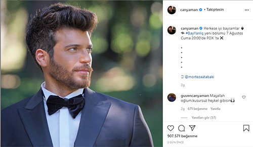 Oynadığı dizilerde ve özel hayatında çoğunlukla kaslarını göstermeyi tercih eden elbiseler giyen ve rahat tavırlarıyla dikkat çeken başarılı oyuncunun takım elbiseli fotoğrafı bir anda günün en çok konuşulan konularından biri oldu ve paylaştığı fotğrafa çok sayıda beğeni ve yorum geldi. Can Yaman’ı ilk defa takım elbiseyle gören hayranları "Aferin, ilk defa giyinmişsin, yakışmış!" yorumları yaptılar.
