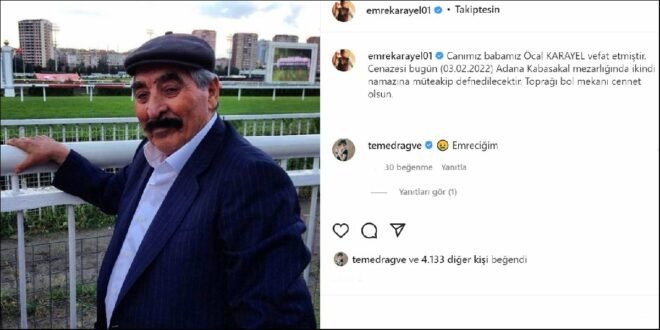 Acı haberi kişisel sosyal medya hesabı Instagram’dan babasının fotoğrafıyla paylaşan Emre Karayel, acısını sevenleriyle şu cümlelerle paylaştı: “Canımız babamız Öcal Karayel vefat etmiştir. Cenazesi Adana Kabasakal Mezarlığı’nda ikindi namazına müteakip defnedilecektir. Mekanı cennet olsun”