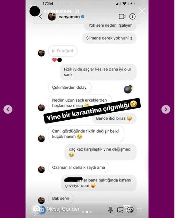 Can Yaman'la olan konuşmalarını ifşa eden Enise Sude, bunu "Yine bir karantina çılgınlığı" sözleriyle paylaştı. Enise Sude’ye attığı mesajda “Canlı gördüğünde fikrin değişir belki küçük hanım” diyen ünlü oyuncunun, attığı mesajları silmek ve gizliden aramak istemesi dikkat çekti.