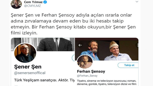 Usta şovmen ve oyuncu cem Yılmaz twitter hesabı üzerinden yaptığı bir paylaşımla Şener Şen ve Ferhan Şensoy adına açılan Twitter hesaplarının sahte olduğu uyarısında bulundu. Usta oyuncular Şener Şen ve Ferhan Şensoy adına açılmış Twitter hesaplarını kendi hesabında paylaşan ve uyarıda bulunan Cem Yılmaz “Şener şen ve Ferhan Şensoy adıyla açılan ısrarla onlar adına zırvalamaya devam eden bu iki hesabı takip etmeyin. Bir Ferhan Şensoy kitabı okuyun, bir Şener Şen filmi izleyin” ifadelerini kullandı. Bu uyarılar Cem Yılmaz’ı takip eden binlerce insan tarafından beğenilirken ünlü isimler adına açılan hesapları takip edenler uyarıldı ve bu iki hesabın ünlü isimler Şener Şen ve Ferhan Şensoy’a ait olmadığı ifade edildi.
