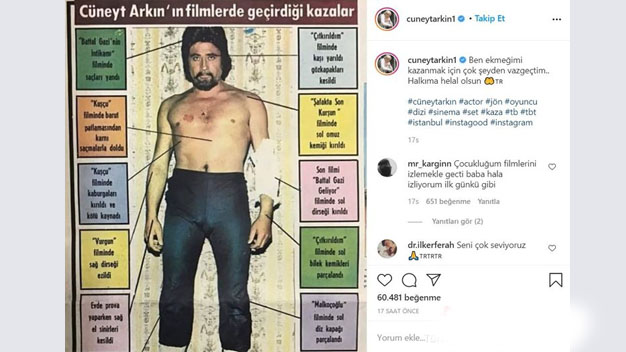 Ünlü oyuncu Cüneyt Arkın bugün 83 yaşında. Yıllara sığdırdığı yüzlerce film var. Özellikle tarihi filmler konusunda en yetkin isimlerden olan Cüneyt Arkın taraflı tarafsız herkesin takdirini kazanmış durumda. Rol aldığı filmlerdeki başarılı performansı ve gözünü budaktan esirgemeyen hali onu bu başarıda basamakları tek tek çıkarırken aynı zamanda da pek çok kazaya uğramasına sebep oldu. Setlerde pek çok kez yaralanan ve hatta ölümlerden dönen Cüneyt Arkın bugün paylaşımında setlerde aldığı yaraları gösteren bir fotoğraf paylaştı. Paylaşımı bir anda ilk sıralara oturan 83 yaşındaki usta oyuncu bu yaraları boşa almadığını göstermek istercesine paylaşımında “ben ekmeğimi kazanmak için çok şeyden vazgeçtim. Halkıma helal olsun” ifadelerini kullandı.