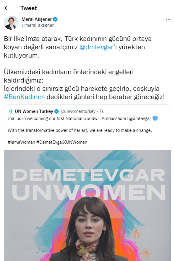 İYİ Parti Genel Başkanı Meral Akşener ise resmi sosyal medya hesabı Twitter’dan Evgar’a büyük destek verdi.