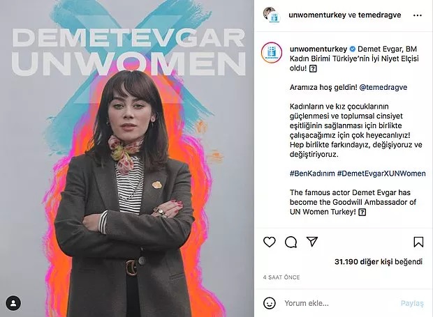 UN Women, Birleşmiş Milletler Kadın Birimi, Türkiye’nin başarılı oyuncularından Demet Evgar’la önemli bir işbirliğine imza atarak Evgar’ı Türkiye ofisinin ilk iyi niyet elçisi olarak ilan etti. Danai Gurira, Nicole Kidman, Emma Watson ve Anne Hathaway gibi isimlerin sahip olduğu ünvana Evgar, 7 Mart günü düzenlenen etkinlikte atandı. İki sene sürecek iş birliği Hashtag BenKadınım farkındayım, değişiyorum ve değiştiriyorum kampanyası ile Dünya Kadınlar Gününde kamuoyuna duyuruldu.