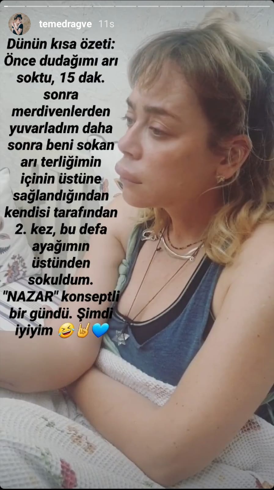 Anne, babası ve kardeşinin de yardımı ile kendisi ile dalga geçerek, dolgu botox yaptırdığını söyleyerek dalga geçti. Üstelik dudağındaki şilik geçmeye başlayınca arı için birde şarkı besteledi. Eline aldığı ukulela ile hem çalıp hem seslendirdi. Yaşadığı anları anlatırken kendisi kadar okuyucu ve izleyiciye de komik anlar yaşatan Demet Evgar semptompların ortadan kaybolduğunu da dile getirdi.