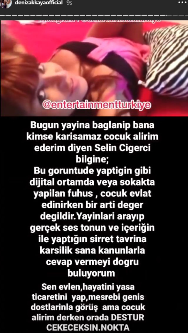 Bundan aylar önce sosyal medya fenomeni Selin Ciğerci, avukatı Şeyda Yıldırım aracılığıyla İstanbul Aile Mahkemesi’ne başvurarak Deniz Akkaya’dan şikâyetçi olmuştu. İddiaya göre Akkaya, “Söylemezsem Olmaz” programına katılarak Selin Ciğerci hakkında ağır suçlamalarda bulunmuştu. Akkaya, magazin programında Selin Ciğerci’ye şu cümlelerle ağır hakaret etmişti: “Kariyeri arabada başladı, orada bitecek. Spor hocama çıplak videolarını göndermiş. Bununla beraber olan adamlara sesleniyorum, siz de sapıksınız. Sen cinsel kimliğini pazarlıyorsun”