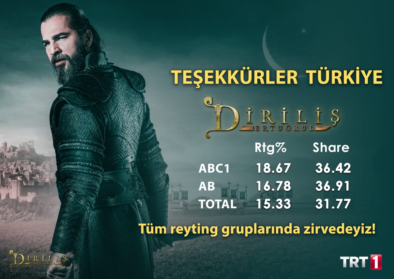 Türk televizyon tarihine damga vuran, TRT1’in uzun soluklu dizileri arasında yer alan, senaryosu Mehmet Bozdağ tarafından kaleme alınan Diriliş Ertuğrul dizisi dün ekrana gelen 127. bölümüyle Total, AB ve ABC1 kategorilerinde en yakın rakibini ikiye katlayarak günü zirvede tamamlayan yapım oldu.