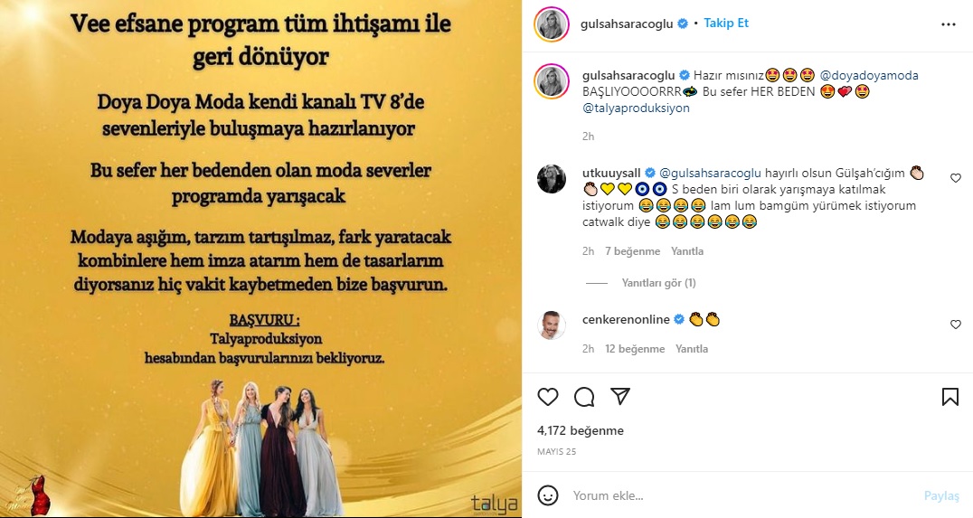 TV8 ekranlarının 2019 -2021 yılları arasında çok beğenilen moda yarışma programı Doya Doya Moda yeni bölümleri ile geri dönüyor. Yapımcılığını Talya Produksiyon’un üstlendiği, Acun Medya yapım şirketi tarafından Acun Ilıcalı’nın kendi kanalı olan TV8 için çekilen moda yarışması, Doya Doya Moda 2022 yılı yaz döneminde yeniden başlayacak. İlk bölümü 25 Kasım 2019 tarihinde ekranlara gelen yarışma programı, tarzını göstermek isteyen belli kilo üstündeki yarışmacıların katıldığı program olarak başlamıştı. 3 sezon süren Doya Doya Moda yarışma programı, ilk sezonu ile 160 bölüm ekranlara geldi, 2. Sezonu ile 175 bölüm yayınlandı ve 3. Sezonda 85 bölüm yayınlanmasının ardınan 9 Temmuz 2021 tarihinde toplam 420 bölüm izleyici ile buluşmuştu. 1 yıl aranın ardından yeniden yeni bölümleri ile TV8 ekranlarına dönmeye hazırlanan programın tanıtım fragmanı da TV8 ekranlarında yayınlanmaya başladı. Doya Doya Moda yarışma programına kimler başvurabilir? Yarışmaya nasıl başvurulur? Merak edilenler haberimizde…