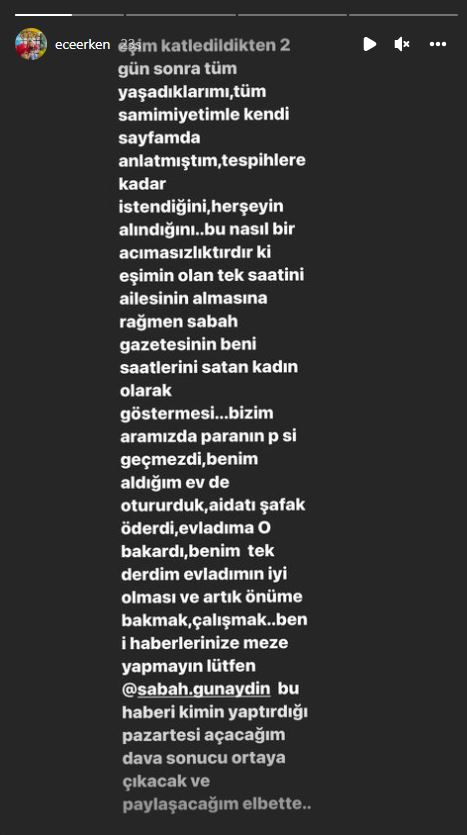 Ece Erken başından geçen üzücü olayla oldukça sarsılmıştı. Yaşananların ardından ortaya atılan iddialar da Ece Erken'i isyan ettirdi. Hakkında yapılan gerçek dışı haberlere karşı yasal yollara başvuracağını söyleyen Ece Erken, eksi bakiyede olan hesabının ekran görüntüsünü de paylaştı. Ece Erken paylaşımında, "Eşim katledildikten 2 gün sonra tüm yaşadıklarımı, tüm samimiyetimle kendi sayfamda anlatmıştım. Tespihlere kadar istendiğini, her şeyin alındığını… Bu nasıl bir acımasızlıktır ki eşimin olan tek saatini ailesinin almasına rağmen sabah gazetesinin beni saatlerini satan kadın olarak göstermesi… Bizim aramızda paranın P'si geçmezdi, benim aldığım evde otururduk, aidatı Şafak öderdi, evladıma o bakardı, benim tek derdim evladımın iyi olması ve artık önüme bakmak, çalışmak. Beni haberlerinize meze yapmayın lütfen … bu haberi kim yaptırdığı pazartesi açacağım dava sonucu ortaya çıkacak ve paylaşacağım elbette" ifadelerini kullandı.