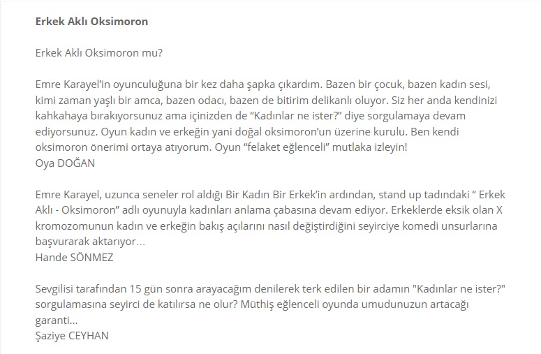 Emre Karayel, tek kişilik performansını şöyle anlatıyor. ‘’Oksimoron’u okuduğumda hissettiklerimi şöyle ifade edebilirim. ‘Bir Kadın Bir Erkek’ ittiğinden beri erkek olmakla ilgili bir şeyler anlatsam nasıl olur diye düşünüyordum. Hatta senaristlerimizle de konuşmuştuk. Tam o sırada Erdal’dan (Beşikçioğlu) böyle bir tekst geldi, okudum ve çok hoşuma gitti. Düşündüğümle uyuşuyordu, beni heyecanlandırdı. Sahnede yalnız kalmam bu defa başta korkutucuydu, korktum açıkçası. Tek başına oynamak zor ama çok keyifli. Tiyatro şöyle bir şey, bir tekst gelir, siz onu okur bir hayal kurarsınız. Yönetmen de hayal kurar. Ve iki hayal birbirine yaklaşırsa ortaya güzel bir şeyler çıkması için teker dönmeye başlar. Çok severek oynuyorum. Oynadıkça seveceğimi de biliyorum. ‘Erkek Aklı’ diyoruz ama o aklı kadınlar bir türlü anlamıyor. Oksimoron kulakta hakaret gibi tınlıyor ama birbiriyle çelişen ifadelerin kullanılmasına deniyor. Erkek aklı da bir oksimoron mu, kadın ne ister gibi soruları, güzel bir hikâye üzerinden anlatmaya çalışıyor.