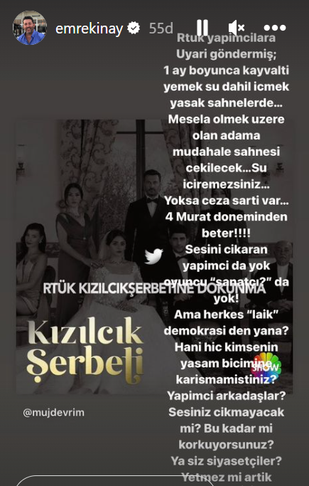Emre Kınay RTÜK’ün dizi film yapımcılarına ramazan ayı dolayısıyla özel bir uyarı gönderdiğini söyledi. Rtük’ün reyting rekorları kıran Kızılcık Şerbeti dizisine tam 5 kez yayın durdurma cezası vermesine tepki gösterdi. Dizi sektörünün yapımcılara yapılan uyarı hakkında sessiz kalınmasını eleştirdi. Emre Kınay sosyal medyadan paylaştığı açıklamasında şu konulara dikkat çekti :“RTÜK yapımcılara uyarı göndermiş… 1 ay boyunca kahvaltı, yemek, su dahil içmek yasak sahnelerde… Mesela ölmek üzere olan adama müdahale sahnesi çekilecek su içiremezsiniz. Yoksa cezai şart var. 4. Murat döneminden beter… Sesini çıkaran yapımcı da yok, oyuncu, sanatçı da yok ama herkes laik demokrasiden yana… Hani hiç kimsenin yaşam biçimine karışmamıştınız… Yapımcı arkadaşlar sesiniz çıkmayacak mı? Bu kadar mı korkuyorsunuz? Ya siz siyasetçiler yetmez mi artık….”