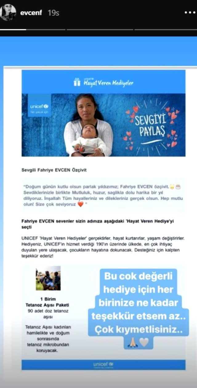 Eşi Burak Özçivit’in sürprizi karşısında çok duygulanan Fahriye Evcen sosyal medya hesabından takipçileriyle sevincini paylaştı. Bunun üzerine harekete geçen Fahriye Evcen'in hayranları ünlü oyuncuya yıldız aldı. Doğum günü olduğunu öğrenen 10 milyondan fazla takipçi Fahriye Evcen’e mesaj göndererek hediye vermek istediklerini ilettiler. Çok duygulan Fahriye Evcen hediye göndermek isteyen hayranlarına hediye yerine hayır kurumlarına bağışta bulunmalarını istedi. Bunun üzerine Fahriye Ecen hayranları başta Unicef olmak üzere çeşitli derneklere bağışta bulundu. Canlitv olarak çok hayırlı bir işe vesile olan Fahriye Evcen’in doğum günün kutluyor ve diğer ünlülere örnek olmasını diliyoruz.