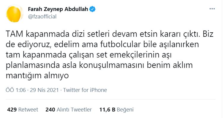 TRT1'de yayınlanan ve sezonun en çok izlenen yapımlarından olan Masumlar Apartmanı dizisinin başrol oyuncu Farah Zeynep Abdullah alınan çalışma kararına tepkiliydi. Sosyal medta platformu Twitter'dan bir paylaşım yapan Abdullah set çalışanlarının da aşılanması gerektiğini belirtti. Farah Zeynep Abdullah, "TAM kapanmada dizi setleri devam etsin kararı çıktı. Biz de ediyoruz, edelim ama futbolcular bile aşılanırken tam kapanmada çalışan set emekçilerinin aşı planlamasında asla konuşulmamasını benim aklım mantığım almıyo" ifadelerini kullandı. Abdullah'ın paylaşımına birçok yorum yapıldı. Genel olarak destek yorumları yapılsa da aşı önceliği olmayan fakat çalışma kararı çıkan sektörlerde çalışanlardan tepki geldi.
