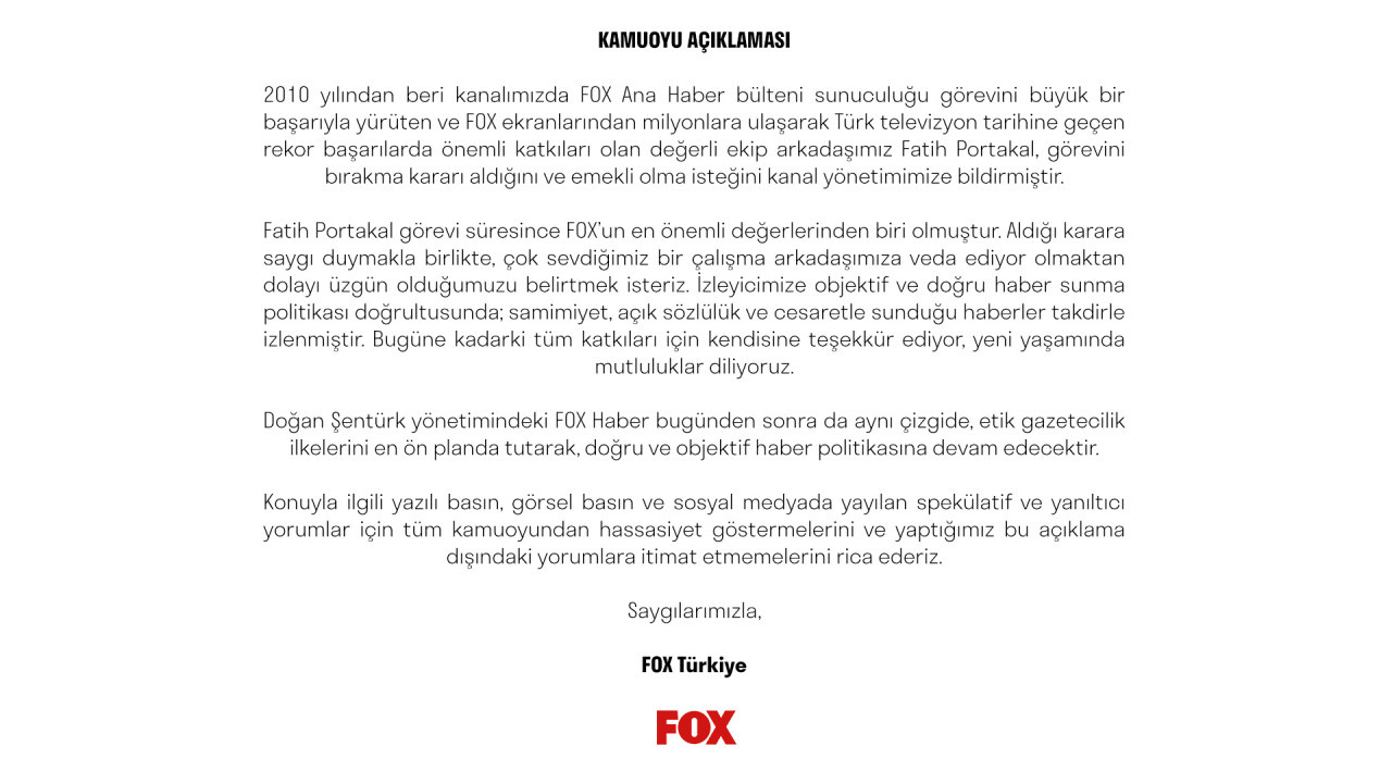 "FOX’un en önemli değerlerinden biri olmuştur." ifadesinin kullanıldığı açıklamayı sosyal paylaşım platformu Twitter hesabı üzerinden açıklama yapan Fatih Portakal, şu ifadeleri kullandı: "Siz veda ederken, çalıştığınız kurumun hakkınızda bu cümleleri kurması her çalışana nasip olmaz. Teşekkür ediyorum @FOXTurkiye @FOXhaber"