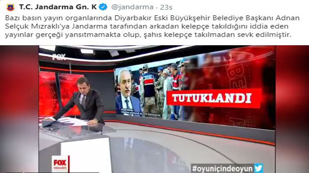 En çok izlenen ana haber bülteni olan Fox Tv de bu görüntülerin yayınlanmasının ardından Jandarma Genel Komutanlığı tarafından görüntülü bir sosyal medya mesajı paylaşıldı. Selçuk Mızraklı'nın tutuklanmaya sevk edilme görüntülerinin yer aldığı videoda Mızraklı'nın ellerinde kelepçe olmadığı görülüyor. Jandarma Genel Komutanlığı bu videoyu şu mesajla birlikte paylaşmıştı; "Bazı basın yayın organlarında Diyarbakır Eski Büyükşehir Belediye Başkanı Adnan Selçuk Mızraklı'ya Jandarma tarafından arkadan kelepçe takıldığını iddia eden yayınlar gerçeği yansıtmamakta olup, şahıs kelepçe takılmadan sevk edilmiştir."