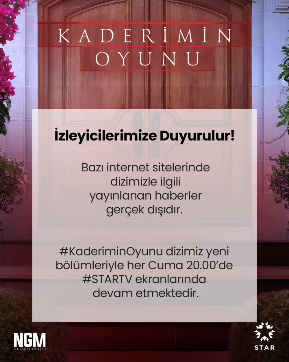 Star Tv ekranlarında cuma günü yayınlanan Kaderimin Oyunu reytinglerde yapımcısının yüzünü güldürmeye devam ediyor. Öykü Karayel, Akın Akınözü, Meriç Aral ve Sarp Apak’ın başrollerini paylaştığı dizinin final kararı verdiği iddia edilmişti. Cuma günleri Arka Sokaklar ve Yalnız Kurt gibi iddialı yapımlar karşısında reytinglere yenik düştüğü öne sürülen Kaderimin Oyunu’nun mart ayının sonunda final yapacağı iddiası sosyal medyada bomba etkisi yaptı. İddiaların hızla yayılması üzerine dizinin yapım şirketi NGM Media'dan bir açıklama yapıldı. İşte o açıklama: "Bazı internet sitelerinde dizimizle ilgili yayınlanan haberler gerçek dışıdır. Kaderimin Oyunu dizimiz yeni bölümleriyle her Cuma 20.00'de Star Tv ekranlarında devam etmektedir."
