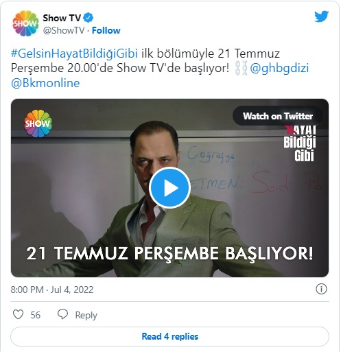 Gelsin Hayat Bildiği Gibi, ilk bölümüyle 21 Temmuz Perşembe 20.00’de Show TV’de izleyici ile buluşacak. Gelsin Hayat Bildiği Gibi dizisi her hafta Perşembe günleri yayınlanacak.