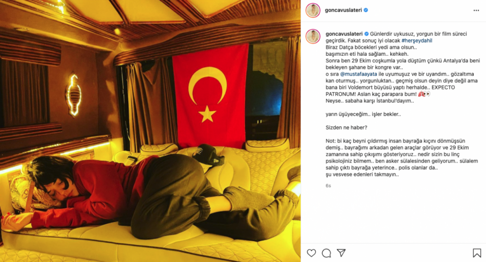 Her şey Dahil adlı filmin çekimleri için Datça'da bulunan Gonca Vuslateri çekimlerden sonra onra Antalya'ya gitmek için yola çıktı. Aracın içerisinde uyurken çekilmiş bir karesini takipçileriyle paylaşan Vuslateri paylaşıma yorum yapan takipçileriyle tartıştı. Ünlü oyuncu kendisine gösterilen bayrak tepkisine adeta isyan etti. İşte bayrağa yapılan saygısızlık ve Gonca Vulateri'nin tepkisi haberimizde. Şimdi detaylar