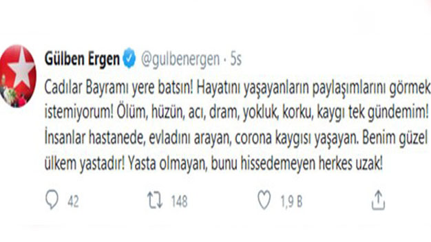 Son günlerde sosyal medya ve magazin basınında yer alan cadılar bayramına ilişkin en sert tepkilerden biri ünlü isim Gülben Ergen’den geldi. Gülben Ergen sosyal medya hesabından yaptığı paylaşımda “Cadılar Bayramı yere batsın! Hayatını yaşayanların paylaşımlarını görmek istemiyorum. Ölüm, hüzün, acı, dram, yokluk, kaygı tek gündemim. İnsanlar hastanede, evladını arayan, koroma kaygısı taşıyan… Benim güzel ülkem yastadır. Yasta olmayan bunu hissedemeyen herkes uzak” ifadelerini kullandı. Gülben Ergen’in bu paylaşımı kısa sürede binlerce beğeni ve yorum alırken pek çok ünlü isimden de destek geldi.