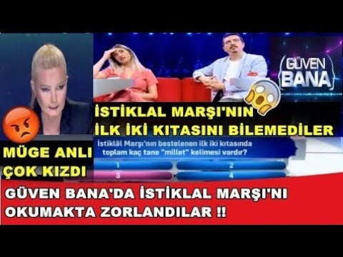 Atv ekranlarında perşembe akşamları yayınlanan Güven Bana yarışma programının son bölümünde ekranlarda nadir görülen bir tartışma yaşandı. Yarışmacılardan Pınar Sarıkaya ve Mete Atakan'a her vatandaşın bileceği ya da bilmesi gereken bir soru soruldu. Önce soruyu sonra da gelişmeleri aktaralım. Soru şuydu: “İstiklal Marşının bestelenen ilk iki kıtasında toplam kaç tane millet kelimesi vardır?" Yarışmacıların soru karşında bocalaması herkesi şaşırttı. Ekran başındakileri bile şaşkınlığa uğratan bu bocalayışa Müge Anlı haklı olarak tepki gösterdi.