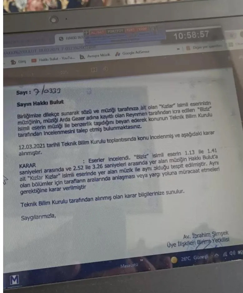 Bir ay süre zarfında Reynmen'den beklediği özrü alamayan Hakkı Bulut, davaya konu olan belgeleri MESAM'a yolladı. Titizlikle yapılan çalışma sonrasında MESAM Bilim Teknik Kurulu iki şarkının müziğinin aynı olduğunu ispatladı. Yapılan hırsızlığı doğrulayan raporda şu ifadeler yer aldı: "Eserler incelendi. 'Biziz' isimli eserin 1.13 ve 1.41 saniyeleri arasında ve 2.52 ile 3.26 saniyeleri arasında yer alan müziğin Hakkı Bulut'a ait "Kızlar Kızlar" isimli eserinde yer alan müzik ile aynı olduğu tespit edilmiştir. Aynı olan bölümler için tarafların aralarında anlaşması veya yargı yoluna müracaat etmeleri gerektiğine karar verilmiştir"