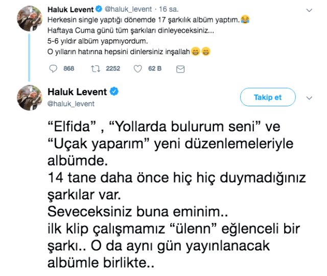 Rock müziğin sevilen ismi Haluk Levent aktif kullandığı Twitter hesabından albüm çıkaracağını şu sözlerle duyurdu: "Herkesin single yaptığı dönemde 17 şarkılık albüm yaptım. Haftaya cuma günü tüm şarkıları dinleyeceksiniz. 5-6 yıldır albüm yapmıyordum. O yılların hatırına hepsini dinlersiniz inşallah."
