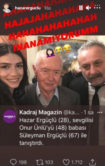 3 yıldır Onur Ünlü ile birlikte olan ve dizi sektörünün aranan isimlerinden olan Hazar Ergüçlü, dizi çekimlerine verilen arada Kıbrıs’a gitti. Ailesinin yanına Kıbrıs'a giden ve deniz sezonunu açan Hazar Ergüçlü hakkında sosyal medyada haber yapıldı. Habere göre Hazar Ergüçlü, babasını ünlü yönetmen Onur Ünlü ile tanıştırdı. Bunun üzerine gözler genç oyuncuya çevrildi. Ancak haber tamamen uydurmaydı. Çünkü resimlerde geçen adam Hazar Ergüçlü’nün babası değil Kıbrıs’ın siyasi isimlerinden Yorgos Vasiliu idi.