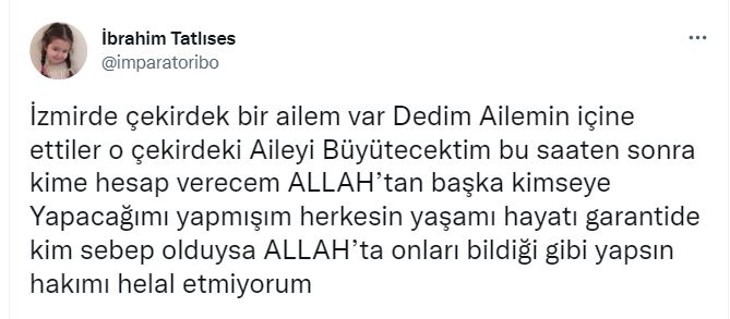 İbarhim Tatlıses'in paylaşımına çok sayıda yorum yapılırken sanatçının kime isyan ettiği ise merak edildi. Çocukları için elinden geleni yaptığını ve herkesin hayatını garantiye aldığını belirten İbrahim Tatlıses hakkını helal etmediğini söyledi. İbrahim Tatlıses uğradığı silahlı saldırı sonrası uzun süre sahnelerden uzak kalmış ve son yıllarda yeniden İbo Show'la ekrana dönmüştü. Evlilikleri, ilişkileri ve çocuklarıyla sık sık gündem olan İbrahim Tatlıses'in Ayşegül Yıldız ile yaptığı 2011 yılındaki evliliğinden bir kız çocuğu oldu. Bu evlilik 2013 yılında son bulmuştu. Daha sonra yardımcısı Gülçin Karakaya ile aşk yaşamaya başlayan Tatlıses'in yarılık nedeni ise henüz bilinmiyor.
