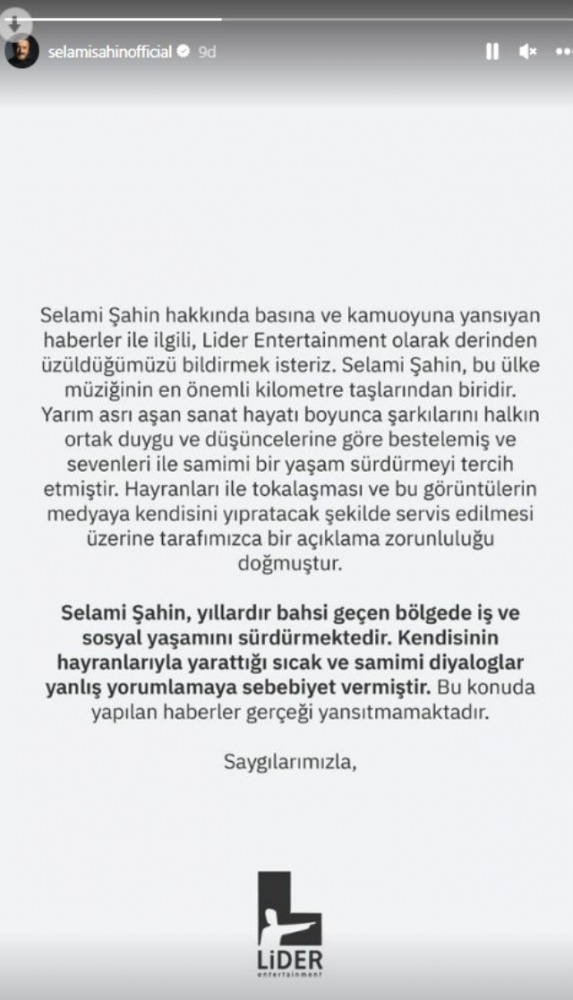 Hakkında çıkan haberlerin ardından Selami Şahin’in menajerlik ajansından hemen bir açıklama yapıldı. Açıklamada şu ifadelere yer verildi; "Selami Şahin hakkında basına ve kamuoyuna yansıyan haberlerle ilgili sanatçının ailesi ve ekibi olarak derinden üzüldüğümüzü bildirmek isteriz. Selami Şahin bu ülke müziğinin en önemli kilometre taşlarından biridir. Yarım asrı aşan sanat hayatı boyunca şarkılarını halkın ortak duygu ve düşüncelerine göre bestelemiş ve sevenleri ile samimi bir yaşam sürdürmeyi tercih etmiştir. Hayranları ile tokalaşması ve bu görüntülerin medyaya kendini yıpratacak şekilde servis edilmesi üzerine tarafımızca bir açıklama yapma zorunluluğu doğmuştur. Selami Şahin yıllardır bahse geçen bölgede iş ve sosyal yaşamını sürdürmektedir. Kendisinin hayranlarıyla yarattığı sıcak ve samimi diyaloglar yanlış yorumlamaya sebebiyet vermiştir. Bu konuda yapılan haberler gerçeği yansıtmamaktadır. Saygılarımızla…"
