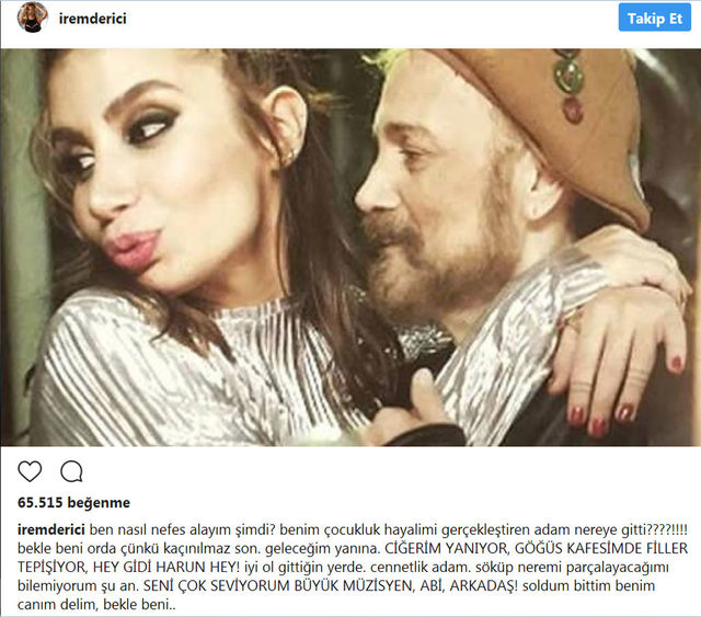Harun Kolçak'ın vefat haberinin ardından, bir yıl önce düzet yaptığı, aynı kilpte oynayıp, birlikte konserlere çıktığı İrem Derici sosyal medya hesabından yaptığı paylaşım ile yürekleri sızlattı.Harun Kolçak'la konser sırasında çekilen fotoğrafını paylaşan İrem Derici, paylaşımına şu notu ekledi: ''Ben nasıl nefes alayım şimdi? benim çocukluk hayalimi gerçekleştiren adam nereye gitti????!!!! Bekle beni orada çünkü kaçınılmaz son. Geleceğim yanına. Ciğerim yanıyor, göğüs kafesimde filler tepişiyor, hey gidi Harun hey! İyi ol gittiğin yerde. Cennetlik adam. Söküp neremi parçalayacağımı bilemiyorum şu an. Seni çok seviyorum büyük müzisyen, Abi, arkadaş! Soldum bittim benim canım delim, bekle beni...''