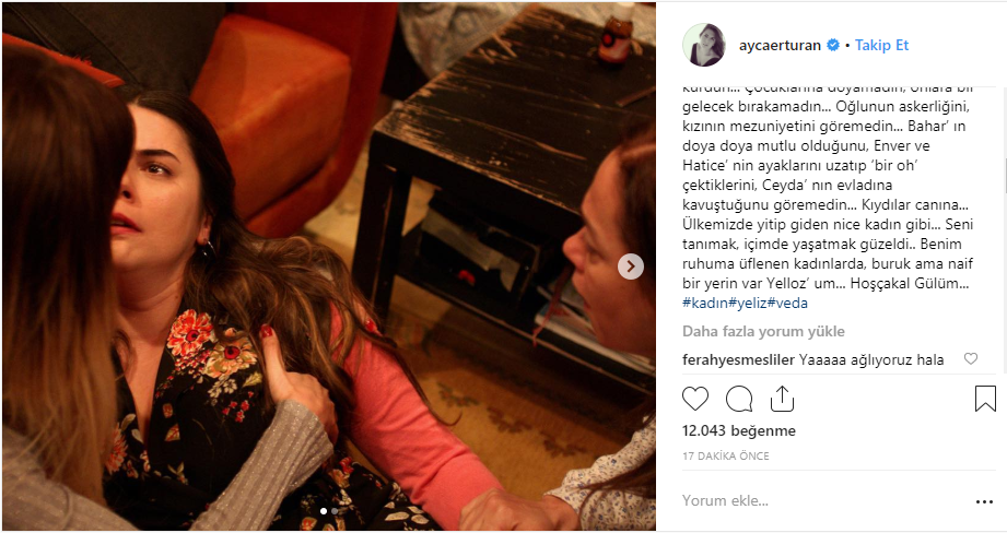 "Bugün sana veda ediyoruz canım Yeliz.... Seninle tanıştığım günü hatırlıyorum... Pembe işçi önlüğüyle yangın merdiveninde ruj sürüp deodorant sıkan o konfeksiyoncu kızı... Saçlarının sarısını, paran olduğunda bile değiştirmeyi akıl edemediğin çantanı, çorabının üstüne giydiğin çiçekli terliğini, diz yapmış pijamanı... Dostluğunu, aklına ilk gelenin dilinden dökülüvermesini, içtenliğini, bazı bazı patavatsızlığını, Şirin’ e haddini bildirmek için hapse girişini... Kısacık ömründe, kendi ayakların üzerinde durmak yerine bir erkeğe sırtını dayamanın doğru olduğunu savunurken, aslında kendinden başka kimsenin seni dik tutamayacağını öğrendin. Dost oldun, sırdaş oldun, sır tuttun diye pişman oldun, hak aradığın da oldu, hakkını yedirdiğin de... Gün geldi güvendiğin adam tarafından sokağa konuldun, yeri geldi dostlarının evinde yuva kurdun... Çocuklarına doyamadın, onlara bir gelecek bırakamadın... Oğlunun askerliğini, kızının mezuniyetini göremedin... Bahar’ ın doya doya mutlu olduğunu, Enver ve Hatice’ nin ayaklarını uzatıp ‘bir oh’ çektiklerini, Ceyda’ nın evladına kavuştuğunu göremedin... Kıydılar canına... Ülkemizde yitip giden nice kadın gibi... Seni tanımak, içimde yaşatmak güzeldi.. Benim ruhuma üflenen kadınlarda, buruk ama naif bir yerin var Yelloz’ um... Hoşçakal Gülüm... #kadın #yeliz #veda"