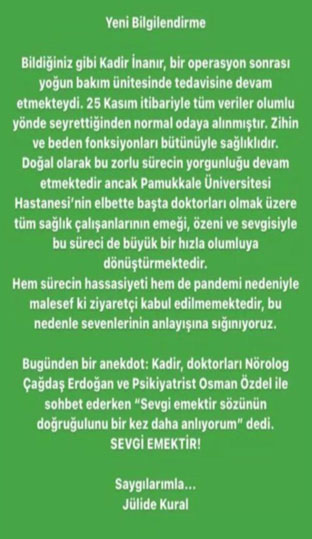 Geçtiğimiz hafta rahatsızlan ve Pamukkale Üniversitesi Hastanesinde yoğun bakım servisinde tedavi altına alınan ve ardından acil olarak ameliyata alınan Kadir İnanır’ın son durumu ile ilgili hayat arkadaşı Jülide Kural açıklama yaptı. Jülide Kural sosyal medya hesabından yaptığı açıklamada “Bildiğiniz gibi Kadir İnanır, bir operasyon sonrası yoğun bakım ünitesinde tedavisine devam etmekteydi. 25 Kasım itibarıyla tüm veriler olumlu yönde seyrettiğinden normal odaya alınmıştır. Zihin ve beden fonksiyonları bütünüyle sağlıklıdır. Doğal olarak bu zorlu sürecin yorgunluğu devam etmektedir ancak Pamukkale Üniversitesi Hastanesi’nin elbette başta doktorları olmak üzere tüm sağlık çalışanlarının emeği, özeni ve sevgisiyle bu süreci büyük bir hızla olumluya dönüştürmektedir. Hem sürecin hassasiyeti hem de pandemi nedeniyle maalesef ki ziyaretçi kabul edilmemektedir. Bu nedenle sevenlerinin anlayışına sığınıyoruz” ifadelerini kullandı. Öbür taraftan Jülide Kural ünlü isim Kadir İnanır’ın doktorlarla bir sohbeti sırasındaki bir sözünü de sosyal medya hesabından paylaştı. Jülide Kural, Kadir İnanır’ın “sevgi emektir… Sözünün doğruluğunu bir kez daha anlıyorum dedi. Sevgi emektir. Saygılarımla” ifadelerini kullandı.