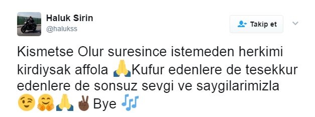 Kısmetse Olur bir diğer yapımcısı Haluk Şirin ise twitter hesabından 'Bir süre İşte Benim Stilim ile beraberiz, sonra eylemlerimiz hızlanarak devam edecek. Kısmetse Olur süresince istemeden her kimi kırdıysak affola. Küfür edenlere de sonsuz sevgi ve saygılarımla. Final,internet yayını ve benzeri sorularınızın cevabı netleşir netleşmez paylaşıcam arkadaşlar...' şeklinde bir açıklamada bulundu. Bu paylaşımın altına ilk yorumda sunucu Seda Akgül'den geldi. Yorumunda 'Dostlar, evet artık Kısmetse Olur yok... Herkese her şey için çok teşekkürler..' ifadelerini kullandı.