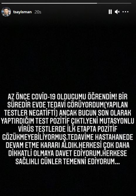 Ünlü oyuncu Tolgahan Sayışman'ın sosyal medya hesabından yaptığı paylaşımda, "Az önce Kovid-19 olduğumu öğrendim. Bir süredir evde tedavi görüyordum. Yapılan testler negatifti. Ancak bugün son olarak yaptırdığım test pozitif çıktı. Yeni mutasyonlu virüs testlerde ilk etapta pozitif gözükmeyebiliyormuş. Tedavime hastanede devam etme kararı aldık. Herkesi çok daha dikkatli olmaya davet ediyorum. Herkese sağlık günler temenni ediyorum" ifadeleri yer aldı.