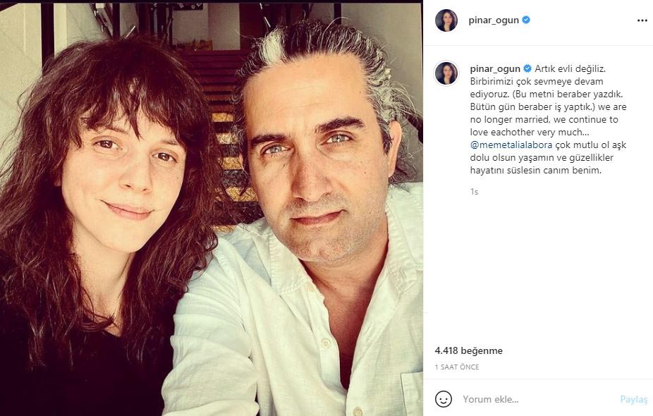 Pınar Öğün yaptığı paylaşıma, "Artık evli değiliz. Birbirimizi çok sevmeye devam ediyoruz. (Bu metni beraber yazdık. Bütün gün beraber iş yaptık.) we are no longer married, we continue to love eachother very much… memetalialabora çok mutlu ol aşk dolu olsun yaşamın ve güzellikler hayatını süslesin canım benim" notunu ekledi. Hem İngilizce hem de Türkçe yazılan notta Pınar Öğün Alabora'ya iyi dileklerini de sundu. Bu paylaşımı Mehmet Ali Alabora da kendi sosyal medya hesabından paylaştı. Birçok başarılı işe imza atan ünlü çift yollarını ayırma kararı alarak evliliklerini sonlandırdı. Pınar Öğün ve Mehmet Ali Alabora birçok sinema ve tiyatro projesinde yer almıştı.
