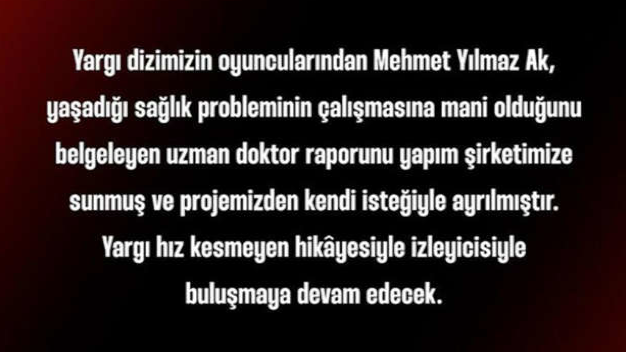 Ay yapım tarafından Kanal D için hazırlanan ve Pazar akşamları ekrana gelen Yargı dizisinin başrollerinden biri olan ve seyircinin çok sevdiği oyuncu Mehmet Yılmaz ak diziyle yollarını ayırıyor. Mehmet Yılmaz ak diziden ayrılma kararını sosyal medya hesabından yaptığı paylaşımla sevenlerine duyurdu. Mehmet Yılmaz Ak paylaşımında “çok severek başladığım ve hala ilk günkü heyecanımla devam ettiğim hayatımda ve kariyerimdeki etkisini hiçbir zaman unutamayacağım Yargı Projesinden erken ayrılmak durumunda kaldığımı üzülerek belirtmek isterim. Ülke olarak hepimizi derinden etkileyen deprem ve sonrası süreçte zor günler geçiren ailem ve sevdiklerimi her anlamda yanında olabilmek adına aldığım bu kararı anlayışla, saygıyla karşılayan, iki sezondur beraber çalıştığım Ay Yapım ailesine ve tüm ekip arkadaşlarıma gönülden teşekkür ederim. Benden tüm bu süreç boyunca sevgisini ve ilgisini eksik etmeyen izleyicilere ve dostlarıma ayrıca teşekkür etmek isterim. Son olarak sağlığımla alakalı uzun vadede endişe edilecek ciddi bir durum yoktur” ifadelerini kullandı.
