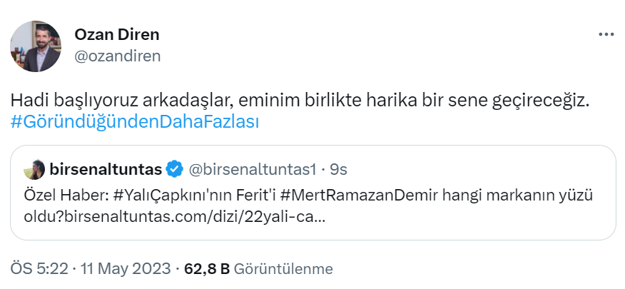 Dimes’in Ceo’su Ozan Diren hayecan dalgası oluşturan yeni kampanyalarının sloganı olan “Göründüğünden Daha Fazlası” etiketi ile “ Hadi başlıyoruz, eminim birlikte harika bir sene geçireceğiz “ paylaşımıyla duyurdu.Haziran ayında yayınlanacak kampanyanın reklam filmleri şimdiden merak konusu oldu. Mert Ramazan Demir'in Dimes reklam filmindeki performansı ve sonraki kampanyalardaki partnerinin kim olacağı şimdiden merak konusu oldu.